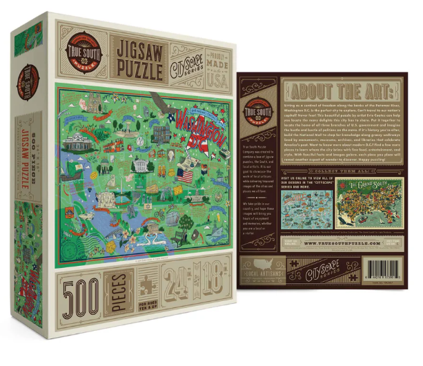 This beautiful puzzle by artist Evie Coates can help you locate the home of all three branches of the U.S. government, explore the National Mall and discover the more modern DC brimming with fine food and entertainment.